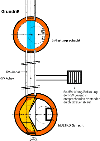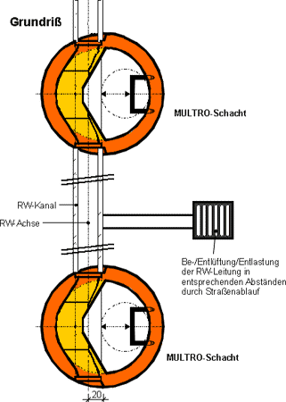 Beim MULTRO®-Schacht wird die obenliegende RW-Leitung in einer Konsole geschlossen durch den Schacht geführt. Die Be- und Entlüftung muss deshalb in geeigneter Weise sichergestellt werden (siehe nebenstehende Abbildung). Dies kann durch Straßenabläufe in entsprechenden Abständen erfolgen, gegebenenfalls kann bei kleineren Nennweiten auch die notwendige Entlastung (analog Versagens-/ Überstaufall im herkömmlichen System) auf diese Weise stattfinden. Falls z.B. im Modifizierten Mischsystem nur der Dachabfluss abgeleitet wird, können die Straßenabläufe für Be-/ Entlüftung / Entlastung z.B. in Grünflächen, Baumscheiben, etc. oder höher liegenden Punkten angeordnet werden.